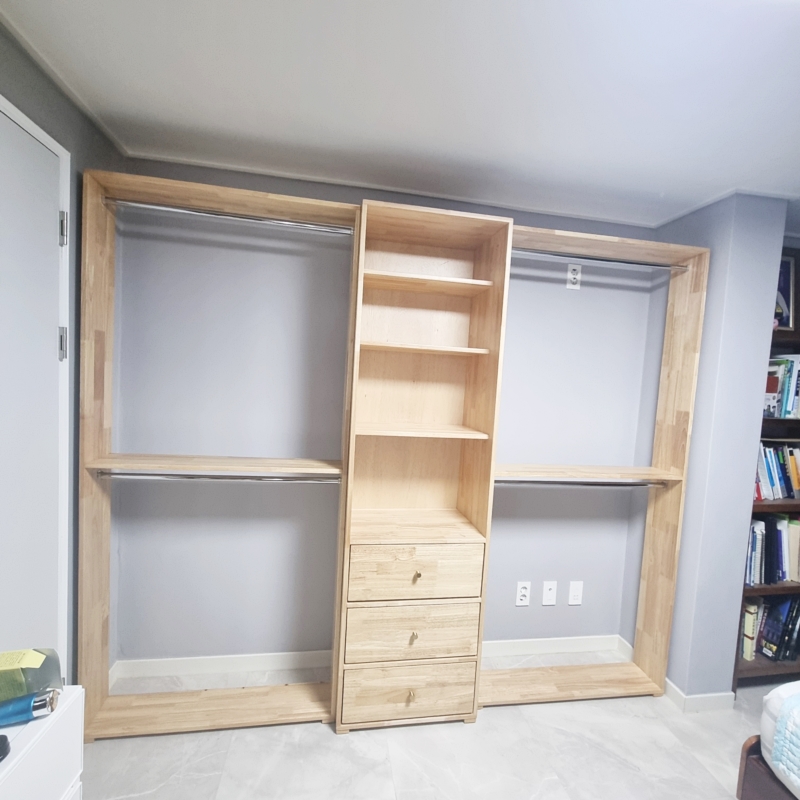 서랍형과 선반으로, 양쪽은 행거형으로 제작된 모습입니다.